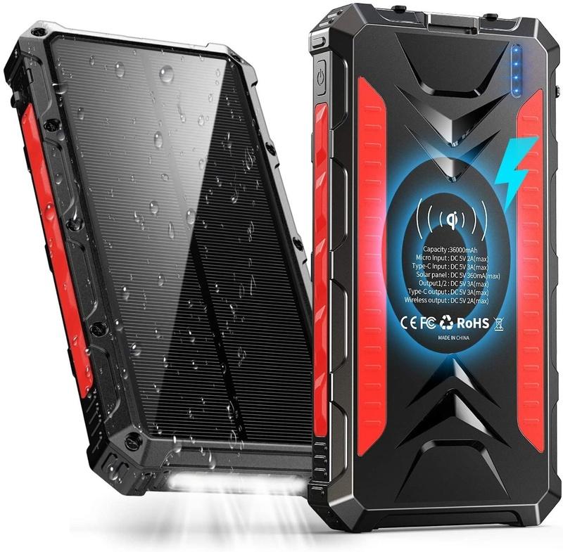 36000 mAh Solar Power Bank with 4 USB/Type C Outputs and LED Lamp, Portable Outdoor Waterproof Qi Wireless Power Bank Solar Panel Compatible for iPhone Samsung Smartphones [36000mAh Ultra High Capacity]: Built-in 36000mAh rechargeable Li-polymer battery, the solar power bank can charge your devices (like cellphone, camera, MP3, MP4, PSP) under the stable power supply. It can automatically adjust the output to deliver the most suitable current, keep your devices from overcharging, over-current, over-voltage and short circuit.Its enough to charge an iPhone XS for 7 times, Samsung Galaxy S10 up to 5-6 times, an iPad Pro for 2 times, Huawei P30 up to 5 times [QI Wireless Charging and Multiple Output Ports]: Equipped with QI wireless charging technology, the solar charger is well compatible with all QI enabled devices. Built-in Dual USB outputs and 1 Type-C output, the solar power bank is able to charge 4 electronic devices (USB/Type-C/QI wireless) simultaneously, so you can choose the convenient way to charge your device. ( Note: Only QI enabled devices can use for wireless charging technology) [Dual Input Ports & Solar Charging 2-in-1]: With dual input ports (high speed Type-C and Micro USB), the solar power bank can be fully charged by 9-12 hours. The solar panel could absorb sun light and convert it into electricity. (Kindly Note: Solar charging is for emergency use, do not take solar power as a primary charging source. Charging the Power bank on Solar only will take around 1 week. It is highly recommend you fully charge via wall charger on first use) [Perfect for Outdoor Enthusiasts]: IP66 rain-proof, dust-proof, shock-proof and splash-proof. Built-in LED flashlight with 3 modes (lighting/ flashing/ SOS), which can be used as camping lamp, emergency lamp and rescue signal lamp. Equipped with solar panel, just hang it on your backpack to recharge via sunlight. It's perfect for outdoor activities, like camping, hiking and other emergencies. [What You Will Get]: 36000mAh portable solar charger, 1X Micro USB cable, 1X Lanyard, 1X Carabiner, 1X User manual.